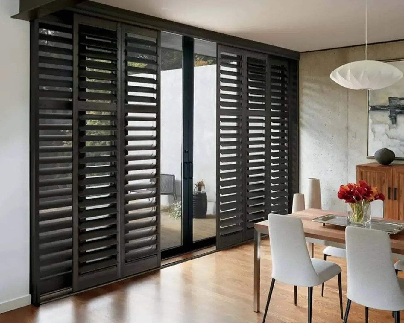 Shutters are adjustable window coverings featuring horizontal slats or louvres that can be tilted to manage light, privacy, and airflow.